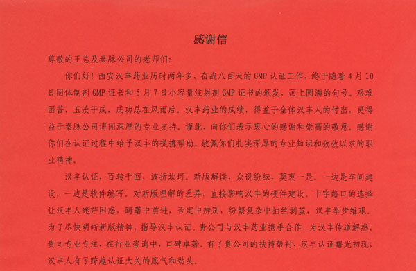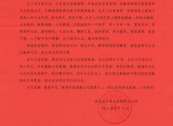 恭賀秦脈公司客戶西安漢豐藥業有限公司順利通過2010版無菌制劑國家局現場檢查,西安漢豐為此至今秦脈,感謝秦脈全體認證咨詢團隊為其提供專業咨詢服務。