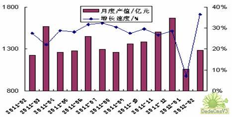 2012年1~2月份,醫藥產業生產快速、銷售回升、出口平穩、投資高漲,總體呈現良好發展態勢。 一、產值快速增長 前2個月,醫藥產業實現產值2342.7億元,同比增長21.4%,增幅較去年全年下降7.1個百分點,但仍維持較高水平。其中,化學藥品原藥430.4 億元,同比增長10.8%;化學藥品制劑680.3億元,同比增長20.9%;中藥飲片129.8億元,同比增長33.3%;中成藥546.7億元,同比增長30.0%;生物生化藥品216.0億元,同比增長15.2%;醫療器械194.9億元,同比增長22.9%。前2個月,醫藥產業工業增加值增長16.4%,高出工業增速5個百分點,較去年全年下降1.5個百分點。 ![]() 二、銷售有所回升 前2個月,醫藥產業實現工業銷售產值2246.2億元,同比增長21.8%;整體產銷率為96.3%,較去年同期增加0.3個百分點。與去年同期相比,除 化學藥品制劑產銷率下跌1.9個百分點、醫療器械產銷率下跌0.9個百分點外,其他子行業的產銷率上升幅度均超過1個百分點。 ![]() 三、出口平穩增長 前2個月,醫藥產業實現出口交貨值219.9億元,同比增長16.1%,略低于去年全年增速。其中,中成藥、化學藥品制劑增速較快,分別增長56.9%和21.4%,醫療器械、中藥飲片同比分別下降9.3和1.8個百分點。 四、投資高速增長 前2個月,受國家實施新版《藥品經營質量管理規范》等因素影響,醫藥產業投資繼續高速增長,累計完成投資182.2億元,同比增長44.4%,高出制造業19.7個百分點。 | ||