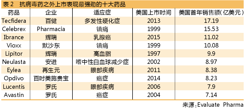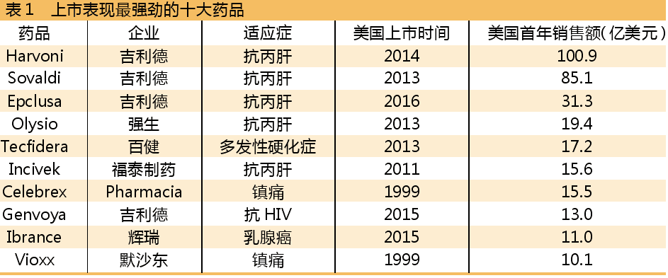 根據對新藥在美國市場頭4個季度的銷售數據分析,排名前四的藥物均為丙肝藥,其中,位列榜首的是吉利德(Gilead Sciences)抗丙肝藥物Harvoni,其在美國市場首年銷售額達到101億美元。該分析沒有列入仿制藥和疫苗,因為這些藥物的銷售模式和剛上市的急性病或慢性病藥物的銷售模式存在很大不同。
