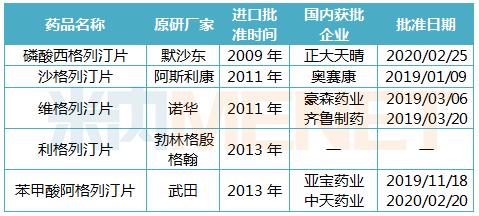 ,國內藥企繼續向DPP4抑制劑發力,2月20日江蘇中天藥業苯甲酸阿格列汀片獲批;2020年2月25日,正大天晴拿下磷酸西格列汀片首仿。