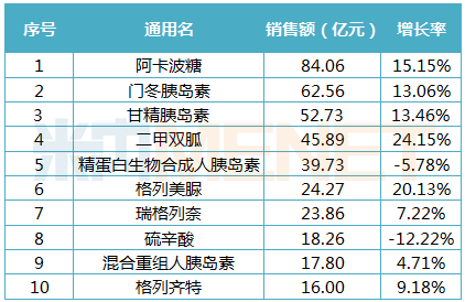 糖尿病用藥通用名TOP10中,10個品種2018年在中國公立醫療機構終端銷售額均過10億元。阿卡波糖以84億元的銷售額居首,胰島素占據四個席位,二甲雙胍以24%增長率領跑,TOP10品種中暫未見到DPP4