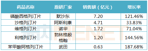劑銷售額都有明顯的增長,其中,阿格列汀銷售增長率高達187.68%,西格列汀、利格列汀銷售增長均翻倍。隨著仿制藥相繼獲批上市,DPP4抑制劑市場也有望進一步擴容。