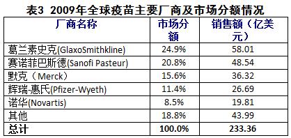 在2009年排名前五位的疫苗企業(yè)中,葛蘭素史克公司以24.9%的分額居第一位,這主要得益于其流感產(chǎn)品Fluvarix和Hiberix的喜人的銷售業(yè)績;緊隨其后的是安萬特-巴斯德,其市場(chǎng)分額為20.8%;默克公司以15.6%的市場(chǎng)份額位居第三;而輝瑞(惠氏)和諾華則分別以11.4%和8.5%的占有率分列第四和第五位。2009年,諾華強(qiáng)勁的增長主要來源于其在疫苗及診斷試劑領(lǐng)域?qū)ι帜X炎疫苗、流感疫苗、兒童免疫產(chǎn)品等的擴(kuò)展,使得該領(lǐng)域的年度銷售額高達(dá)19億美元。盡管如此,綜觀該公司在整個(gè)疫苗市場(chǎng)中的實(shí)力,其仍要落后于其他四位強(qiáng)勢(shì)的競(jìng)爭(zhēng)對(duì)手。