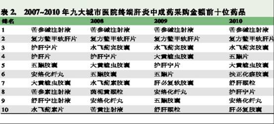 市場競爭激烈 在九大城市醫院終端采購中,用于治療肝炎的中成藥品種超過200種,生產廠家高達300多家,由此可見,肝炎用中成藥的市場競爭比較激烈(見表1)。該大類中,一直穩居榜首的是苦參堿注射液,緊跟其后的是復方鱉甲軟肝片,水飛薊賓膠囊自2008年后一直穩居第3(見表2)。