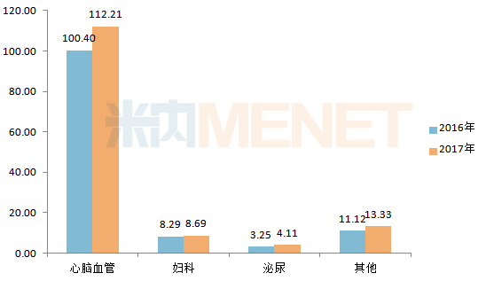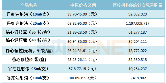 (數據來源:上市公司年報) 步長制藥主營業務涉及到了心腦血管、婦科、泌尿等領域,2017年該公司心腦血管業務營業收入再次突破百億元大關,增長率為11.76%;婦科業務營業收入為8.69億元,增長率為4.77%;泌尿業務營業收入為4.11億元,增長率為26.45%。 據米內網數據顯示,2016年在中國城市公立醫院、縣級公立醫院、城市社區中心以及鄉鎮衛生院(簡稱中國公立醫療機構)終端中成藥心腦血管疾病用藥企業TOP5中,步長制藥以10.76%的市場份額排在首位。 該公司心腦血管相關的產品包括了中成藥丹紅注射液、腦心通膠囊、穩心顆粒以及化學藥谷紅注射液,四大產品均為獨家,治療范圍涵蓋中風、心律失常、供血不足和缺血梗塞等常見心腦血管疾病。 其中,丹紅注射液、腦心通膠囊、穩心顆粒均進入了2016年在中國公立醫療機構終端中成藥心腦血管疾病用藥品牌TOP20的榜單中。谷紅注射液可用于治療腦血管疾病,如腦供血不足、腦血栓、腦栓塞及腦出血恢復期,肝病、神經外科手術等引起的意識功能低下,智力減退、記憶力障礙等,還可用于治療冠心病、脈管炎等。米內網數據顯示,谷紅注射液在2016年中國公立醫療機構終端化學藥神經系統藥物精神興奮藥品牌TOP20中排名第六注。 表1:四大產品在藥品集中招標采購中的中標情況