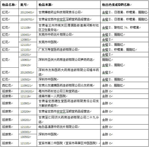 日前,國家食品藥品監(jiān)督管理總局組織開展了中藥飲片違法染色問題專項抽驗。 按照藥品“兩打兩建”專項行動工作部署,總局組織對安徽、甘肅、廣東和四川4個省相關(guān)單位生產(chǎn)、經(jīng)營或使用的部分中藥飲品進(jìn)行了抽樣。專項抽驗共抽樣397批,檢驗證實22批存在染色問題,共涉及紅花、延胡索、西紅花3個品種。為保護(hù)公眾用藥安全,現(xiàn)將存在染色問題的中藥飲片及相關(guān)生產(chǎn)、經(jīng)營和使用單位予以曝光。 對中藥飲片進(jìn)行染色危害公眾用藥安全,欺騙消費(fèi)者,是嚴(yán)重的違法行為。總局已責(zé)成相關(guān)省(區(qū)、市)食品藥品監(jiān)督管理局對抽驗證實存在染色問題的中藥飲片及相關(guān)單位依法查處。 不符合標(biāo)準(zhǔn)規(guī)定的中藥飲片名單